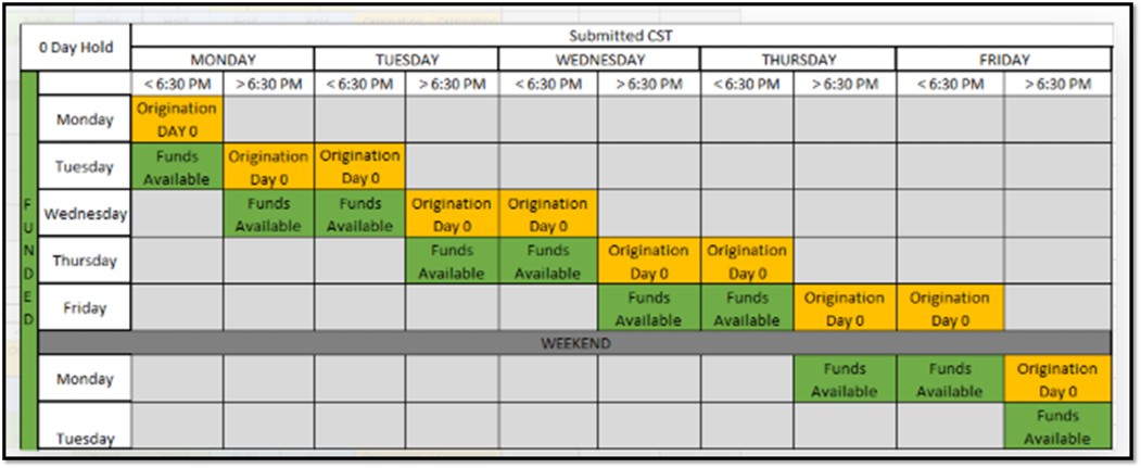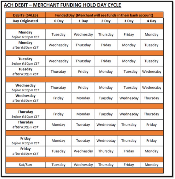 - ACH Withdrawal/Debit follows a funding hold day cycle in CST.