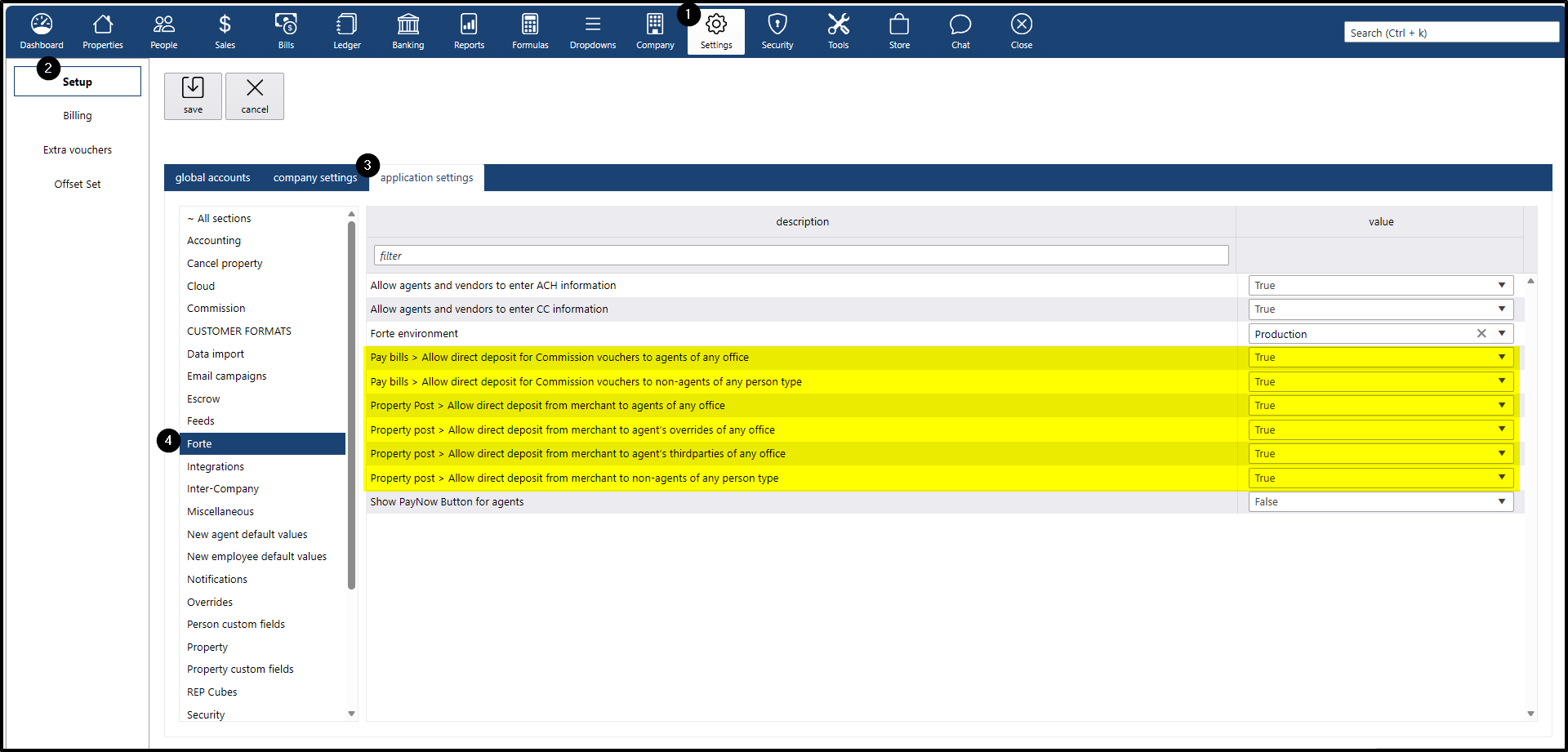 The Forte section under the Application Settings allows administrators to configure direct deposit permissions for commission-related and property-related payments. These settings determine which types of recipients—agents, non-agents, overrides, and third parties—are eligible to receive funds via direct deposit through the integrated merchant account