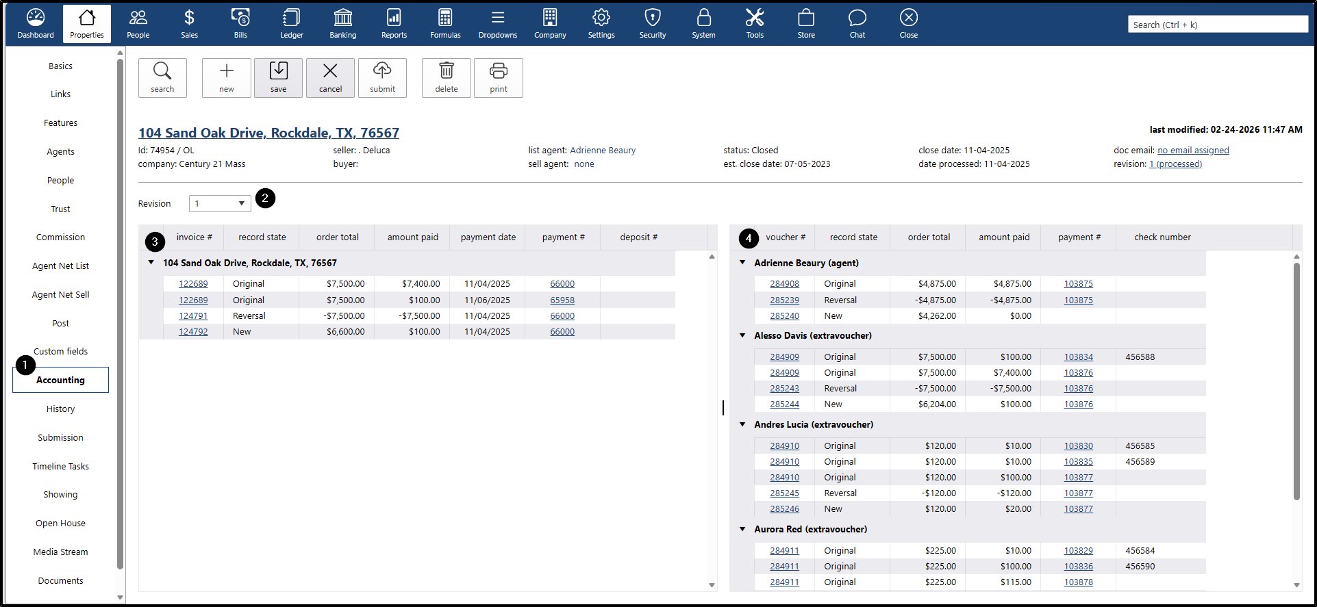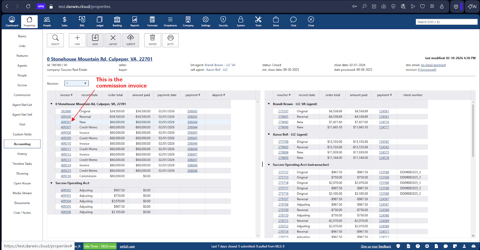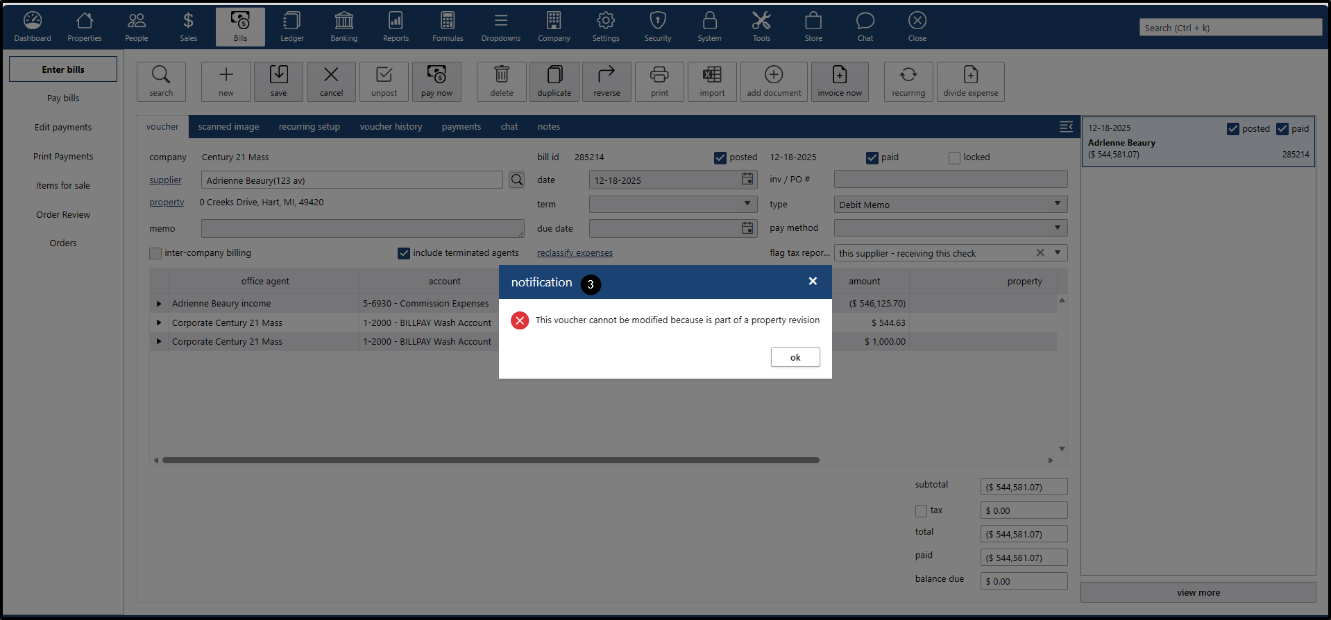 - Search for a closed property with commission, where vouchers and invoices have not been paid yet.