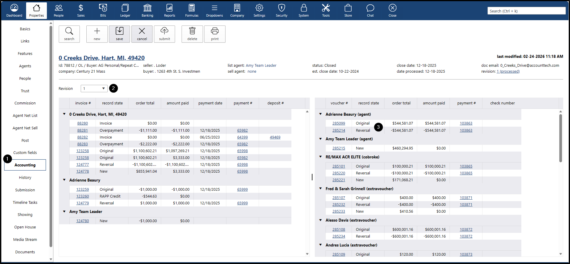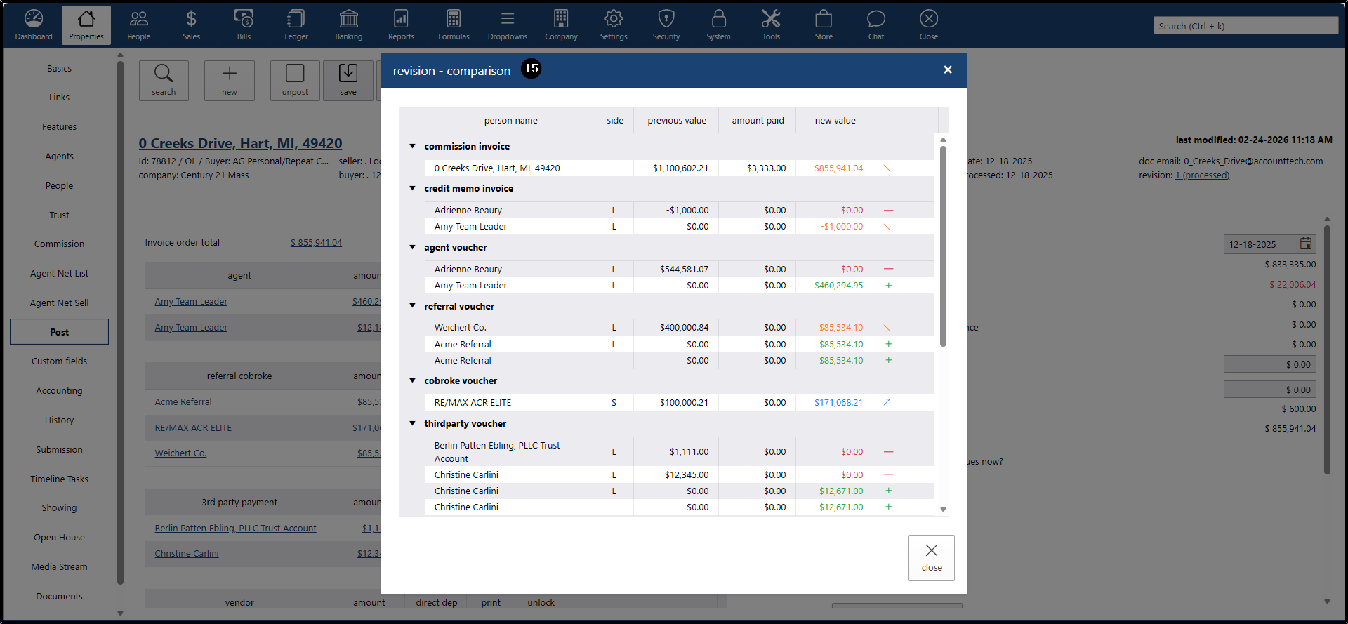 - The system will display a pop-up window showing all the vouchers for the people involved in the property, displaying the new values: