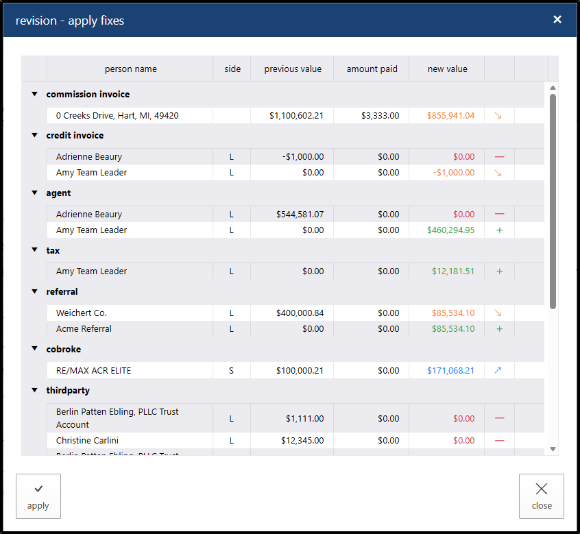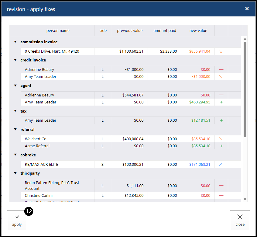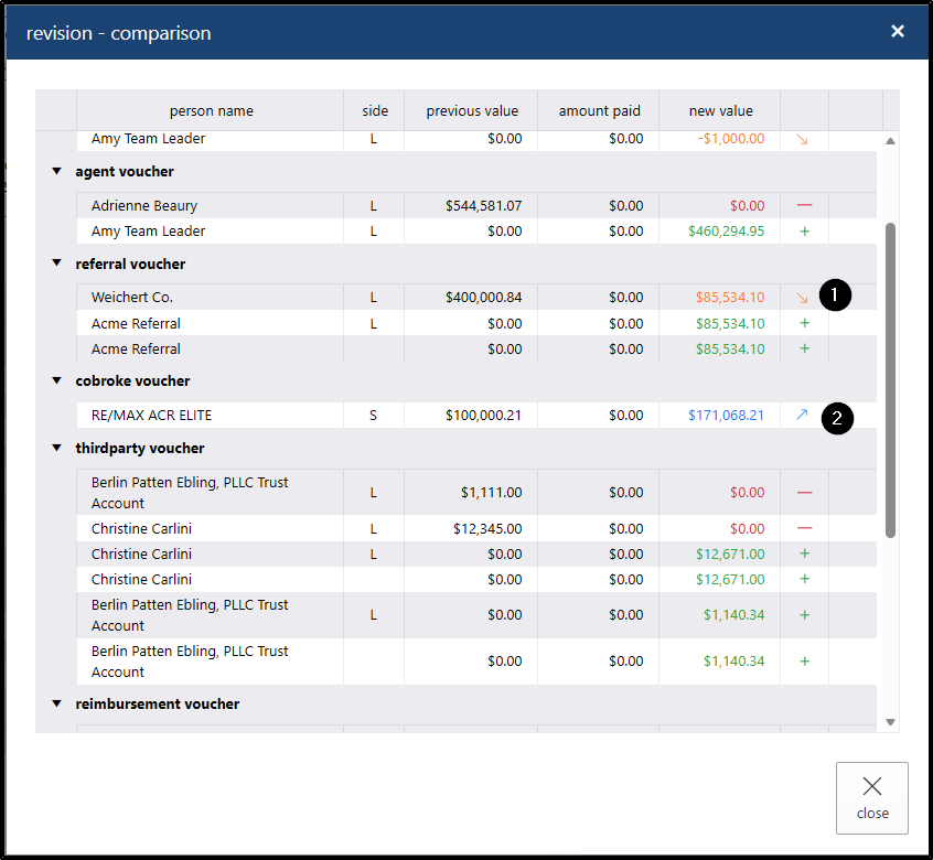 If you want to view the changes made to the property, click the “Revision” link. The system will display a pop-up window showing the change details, with icons indicating whether amounts were increased, decreased, or if people were removed from or added to the property. This pop-up window only shows data from the latest review.
