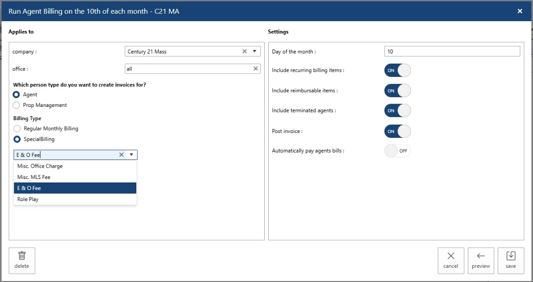 - Bills will be generated for all active agents in the indicated Company and Office(s) (based on the individual agent's setup)