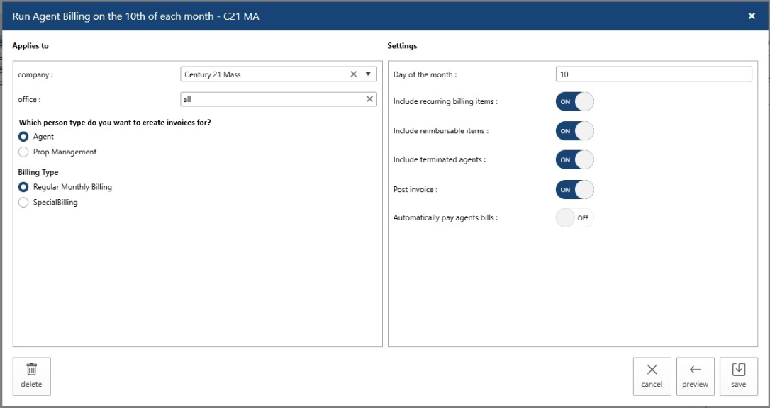 1. Automatic Billing will execute the same functions as the current Agent Billing feature on the Sales > Invoices screen. However, users will be able to save their preferred settings, and the function will run automatically based on a pre-set schedule.